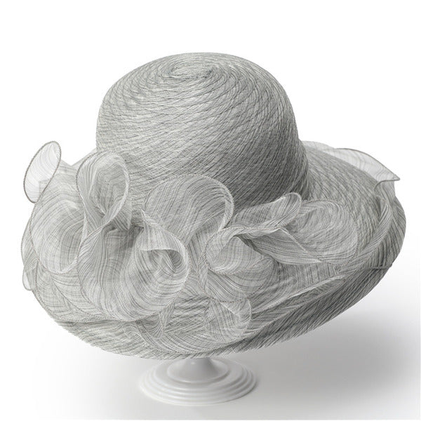 This elegant sun hat is a perfect blend of style and functionality. Crafted with a paper straw crown and a sheer organza ruffled brim, it features a solid cream color that exudes sophistication. The structured mid-to-high profile crown and wide brim make it ideal for special outdoor occasions.