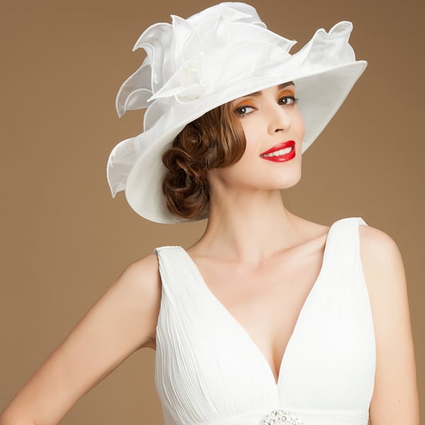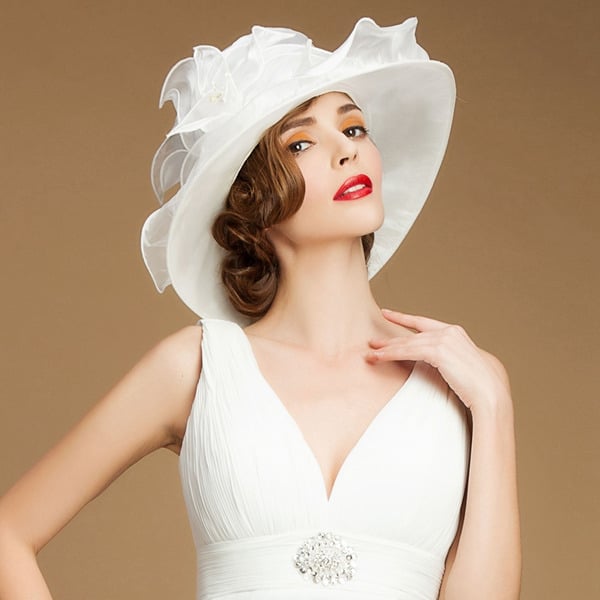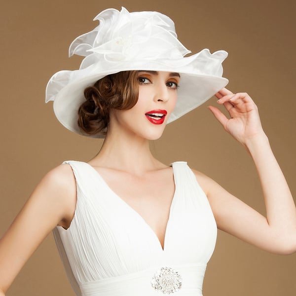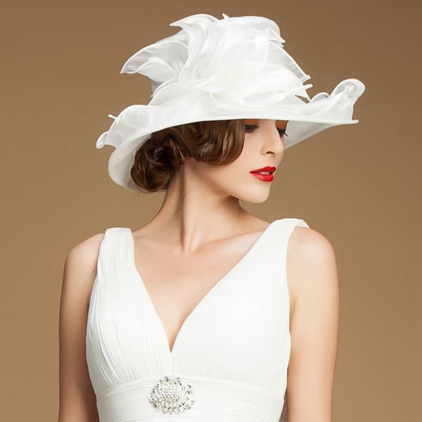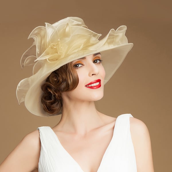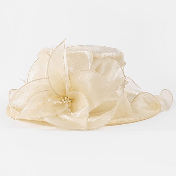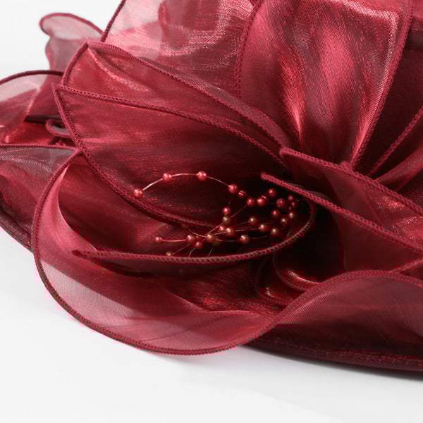 Step into elegance with this formal dress hat crafted from deep burgundy organza. The structured mid-to-high profile crown and wide, pre-curved brim create a classic silhouette, while the large, multi-layered organza flower with beaded accents adds a touch of sophistication.