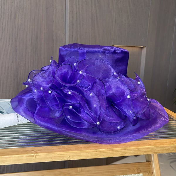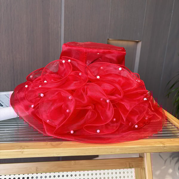 This is a formal fascinator hat crafted from sheer, lightweight organza. It showcases a high – profile, structured crown and an extremely wide, flat brim. The solid white base is adorned with ruffled organza panels and pearl/bead embellishments, exuding a classic and elegant charm.