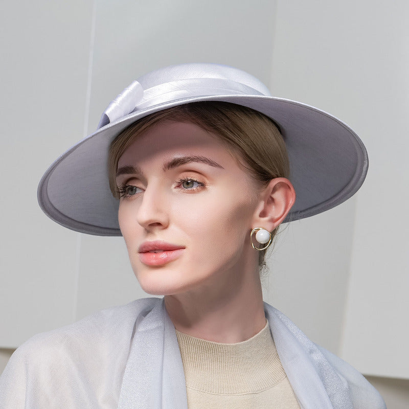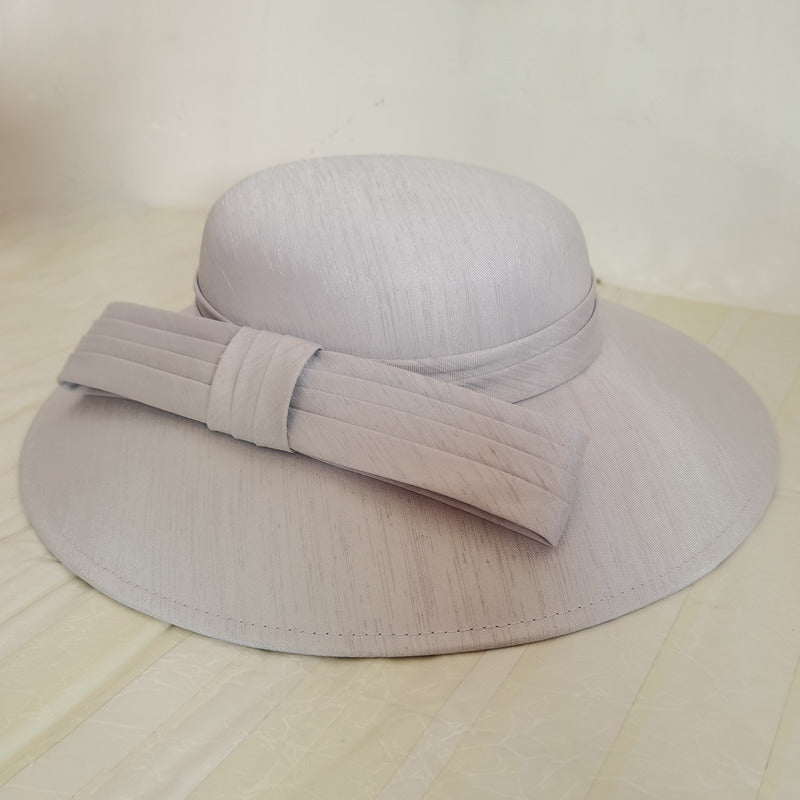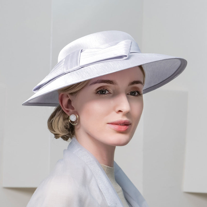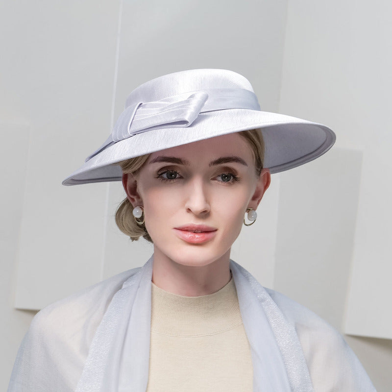 Step into elegance with this structured wide-brimmed formal hat. Crafted from a synthetic satin or silk-blend, it boasts a smooth, glossy texture. The solid light pastel color, paired with a large, structured bow on the front, exudes classic and elegant charm, making it a perfect accessory for formal events.