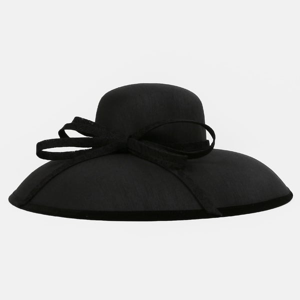 Introducing a stunning Kentucky Derby-style formal dress hat crafted from high-quality wool felt. This hat features a structured crown and a wide, flat brim, creating an elegant and sophisticated look. The solid black color is complemented by a black satin bow on the crown, adding a touch of classic charm.