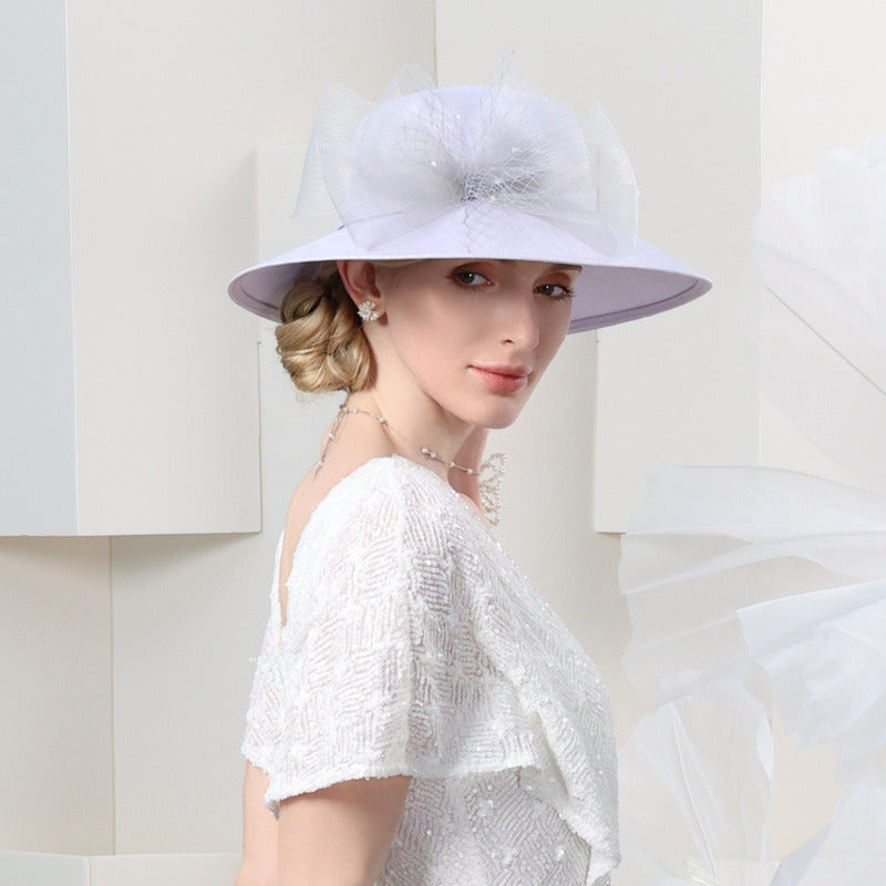 This is a formal sun hat crafted from a smooth, structured synthetic fabric. It features a pale lavender base color with a large, voluminous white tulle bow on the front, adding a touch of elegance. The wide, flat brim and high – profile structured crown make it a perfect accessory for special occasions.