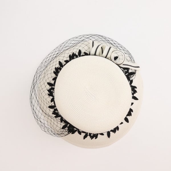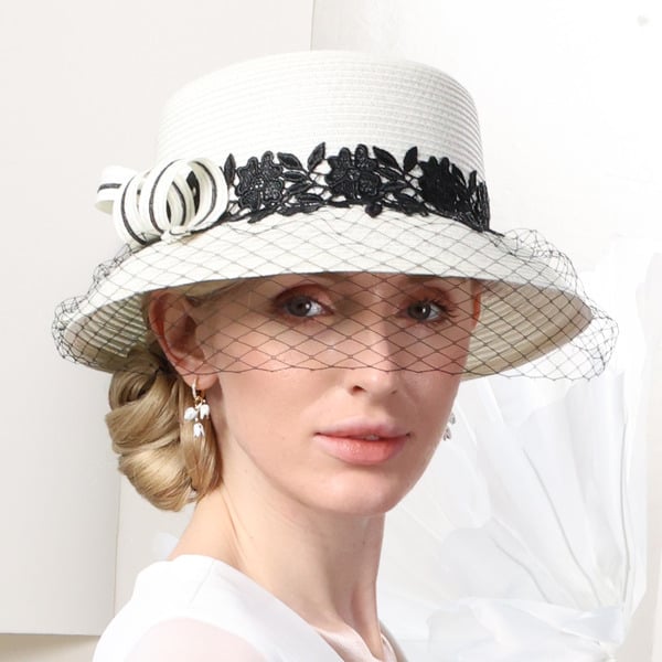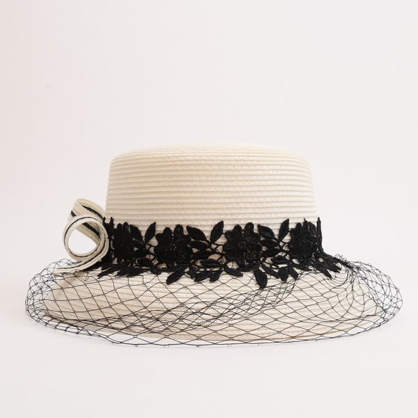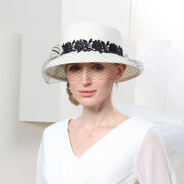 This formal hat is a stunning piece of millinery. It features a structured high – profile crown and a wide flat brim made from straw. The white base is beautifully accented with black floral lace and a fine mesh veil, along with a white/black rosette, creating a classic and vintage – inspired look.