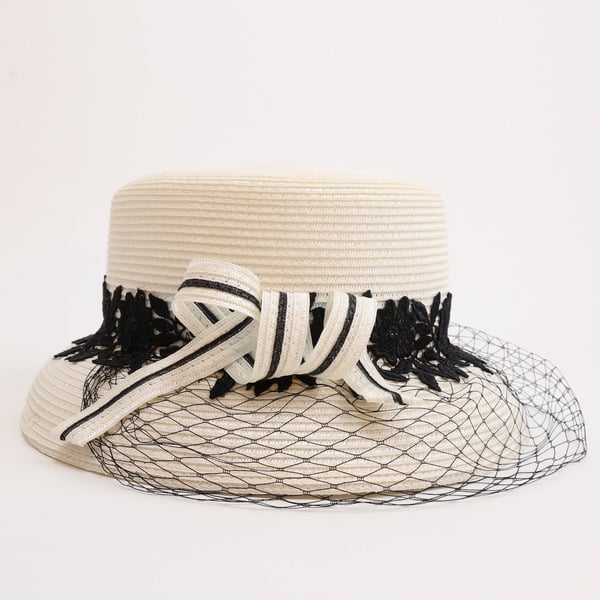 - Material: Straw (or synthetic straw blend) for the hat base, fine mesh for the veil, and lace (likely synthetic or cotton) for decoration