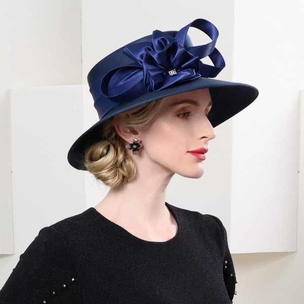 Enhance your formal look with this stunning deep navy blue formal wide-brimmed dress hat. Crafted from smooth and polished polyester satin, it features a structured mid-to-high profile crown and a wide, flat brim. A large, structured satin bow with a sparkling rhinestone accent at the center adds a touch of elegance.