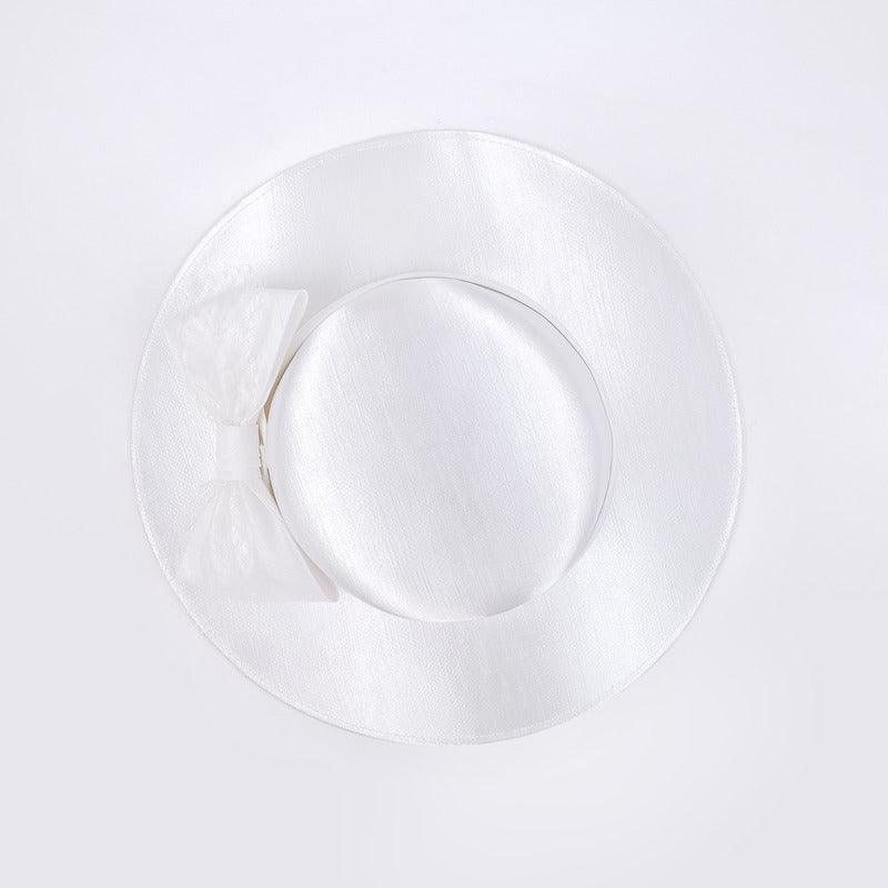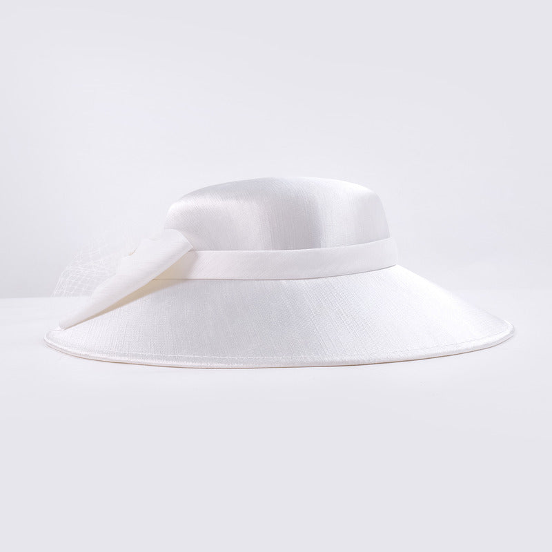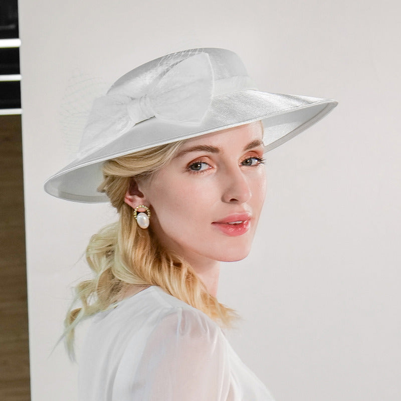 Introducing a stunning formal wide-brimmed dress hat crafted from smooth, glossy synthetic satin. This solid white hat features a delicate decorative piece on the left side, adding a touch of feminine elegance. Its structured mid-to-high profile crown and wide flat brim create a classic silhouette perfect for formal occasions.