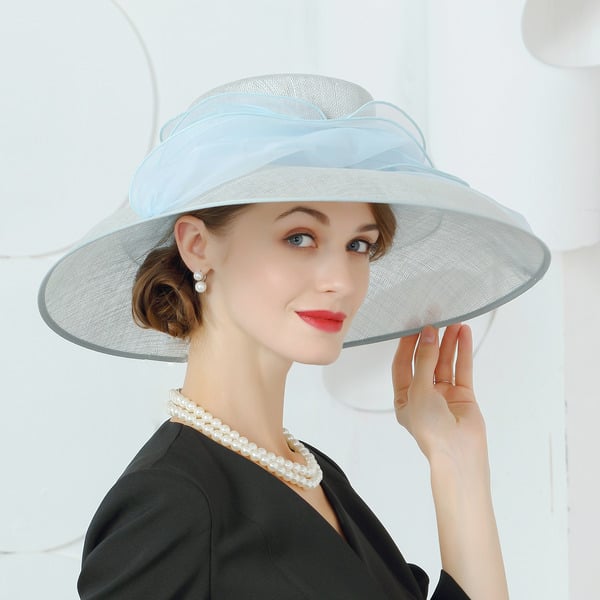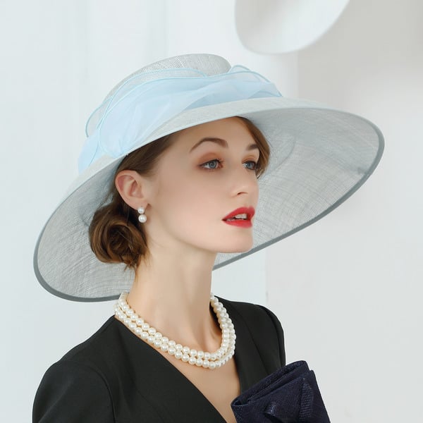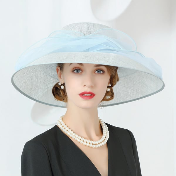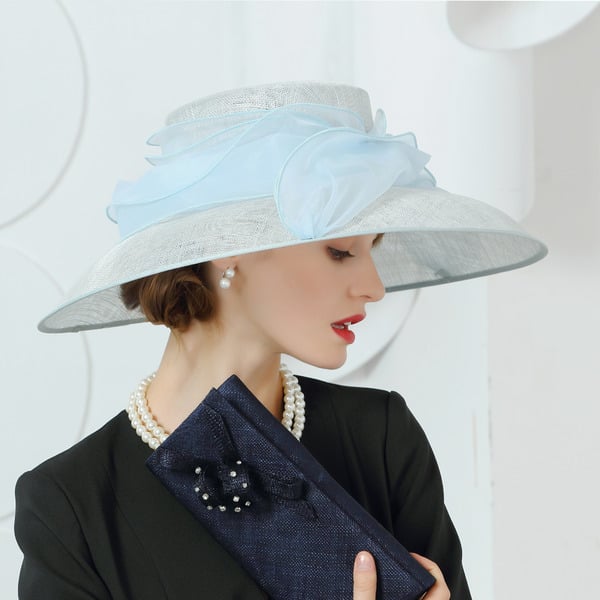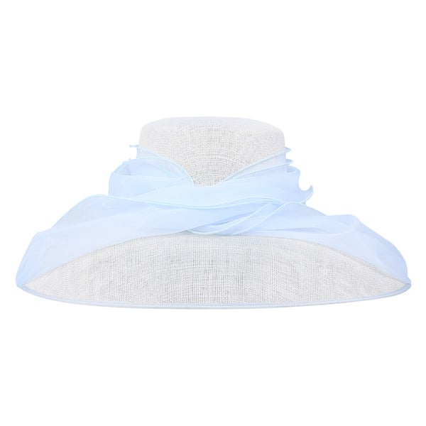 Step into elegance with this formal sun hat crafted specifically for women. The hat showcases a pale gray/white woven straw body, offering a classic and sophisticated look. A large sky blue layered organza bow adorns the front, adding a vibrant and feminine touch perfect for formal occasions.