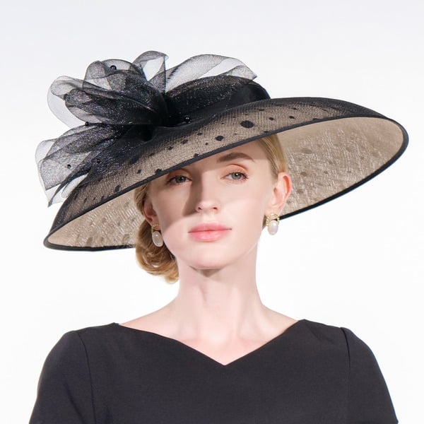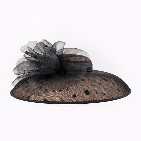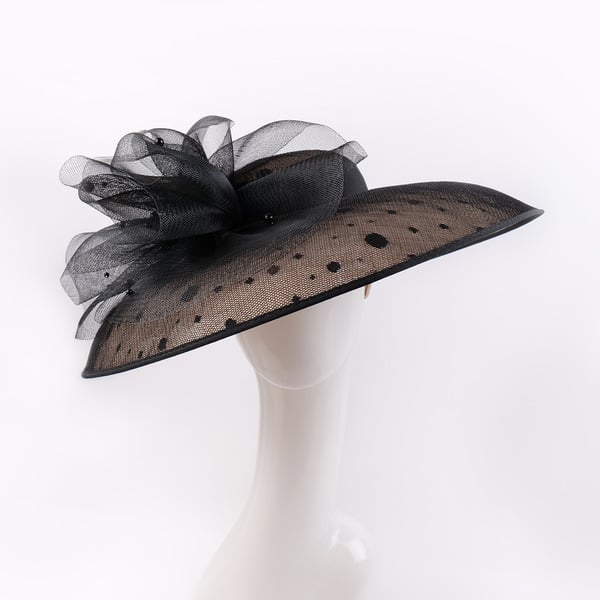 Step into elegance with this stunning wide-brimmed formal dress hat. Crafted from sheer synthetic netting, it features a classic and fashion-forward design. The solid black base with a dotted pattern and a multi-layered structured bow exudes high – fashion charm, perfect for formal events.