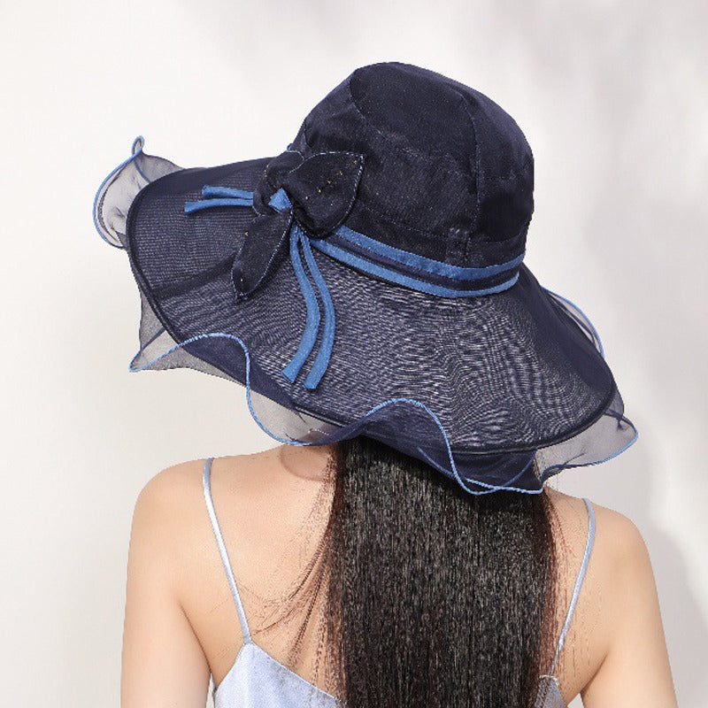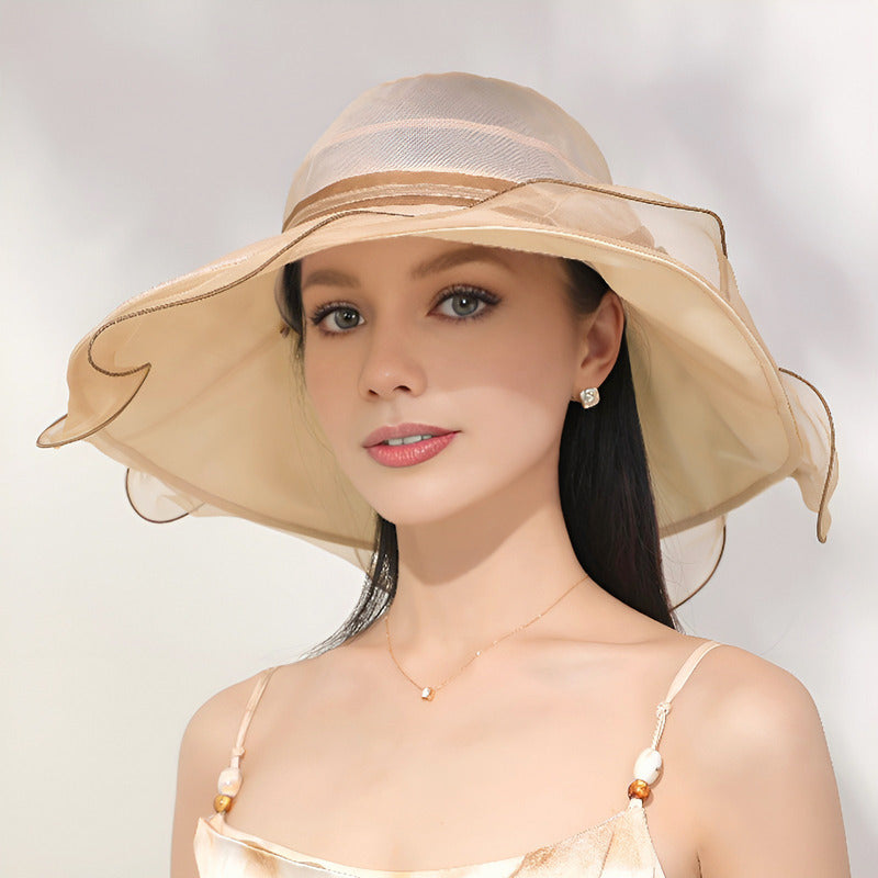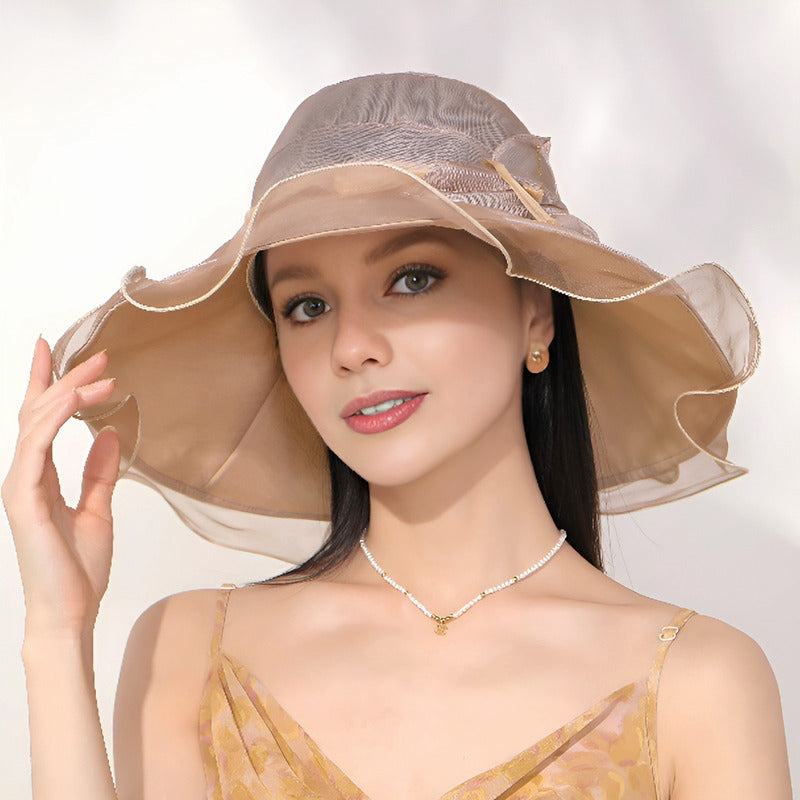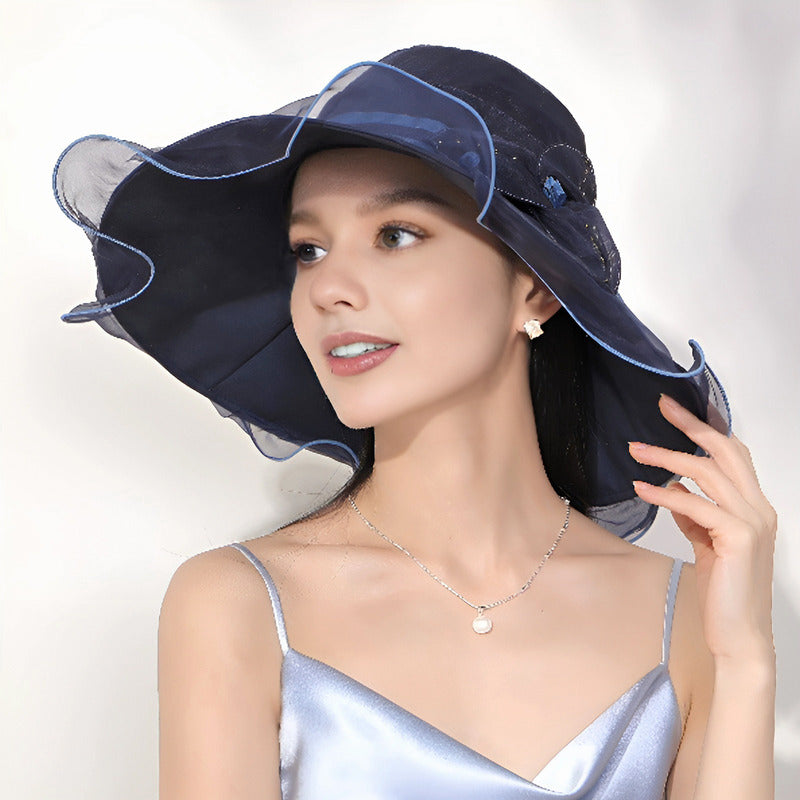 - Brim/Visor: Wide, pre-curved with a frilled, sheer trim