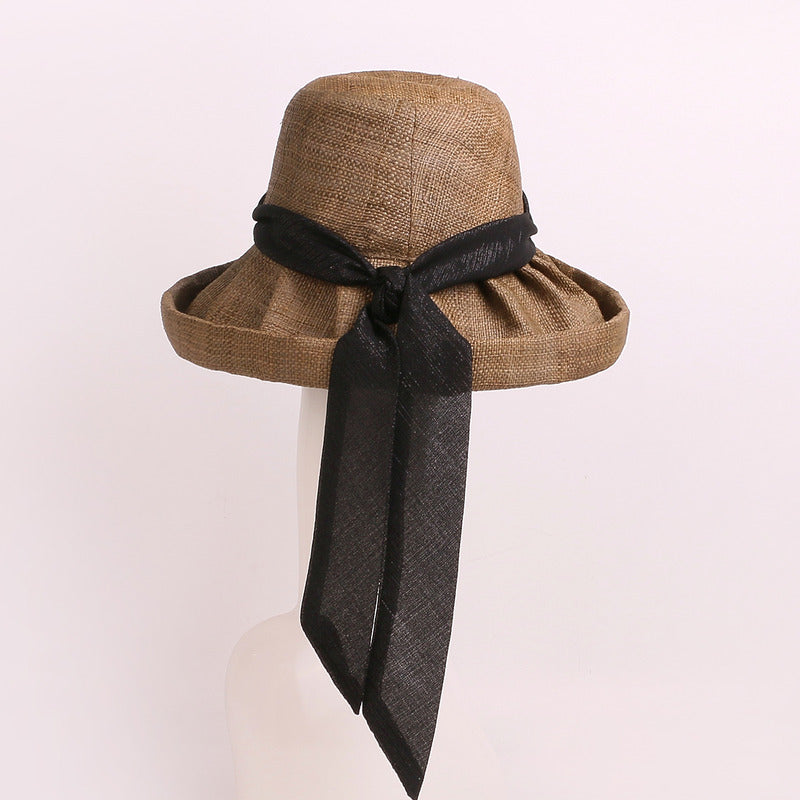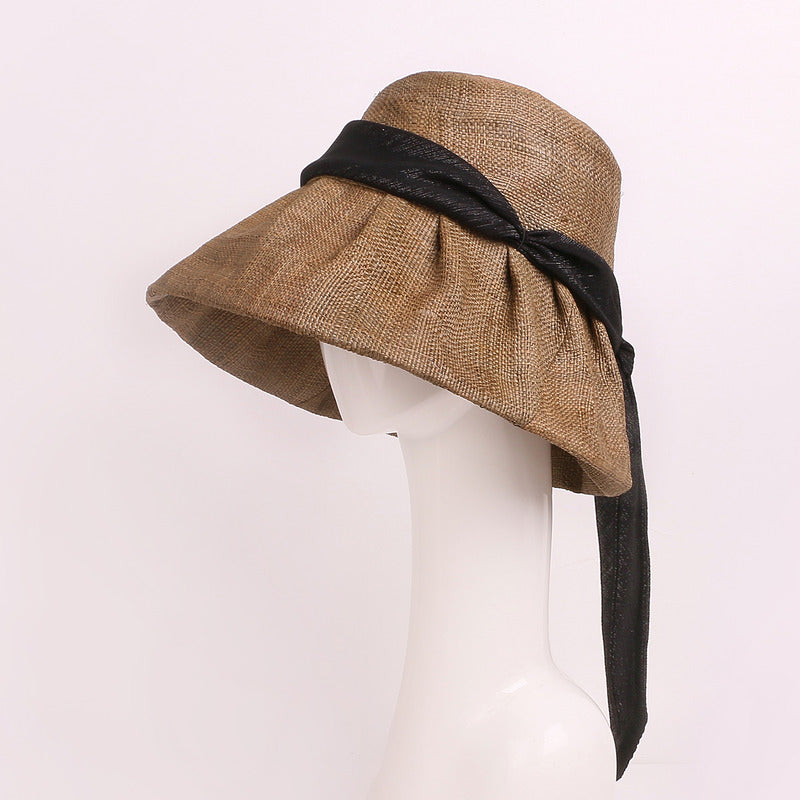 - Material: Straw or straw-like woven fabric (linen-straw blend), black satin ribbon