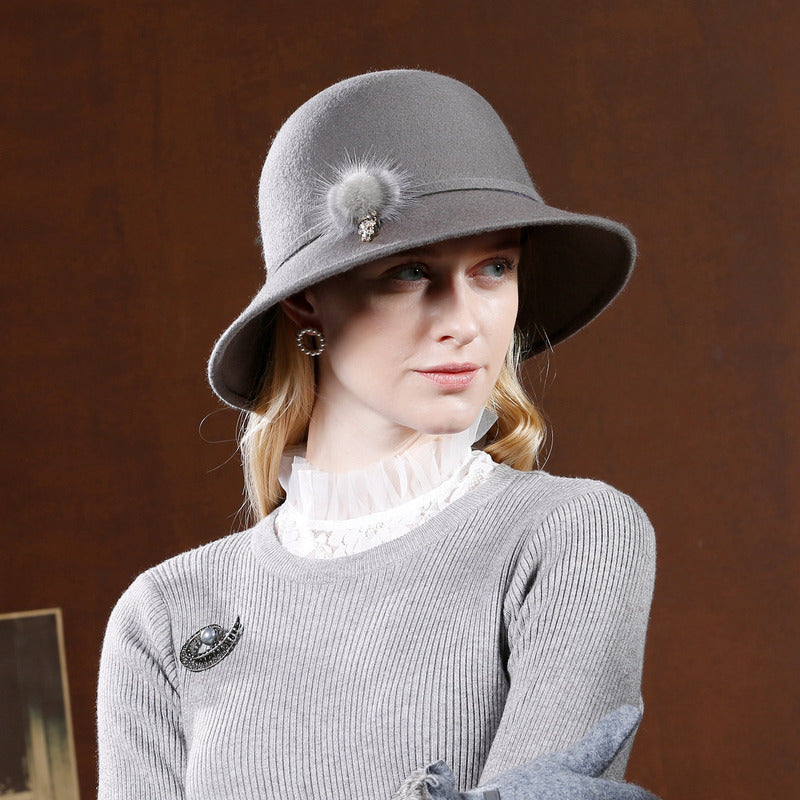 Step into timeless elegance with this classic wide-brim felt hat. Crafted from luxurious wool felt, it showcases a solid gray color that’s both neutral and seasonally appropriate for winter. The left brim features a charming small, light gray/white fur-like pom-pom attached with a dark metal brooch, adding a touch of vintage charm.