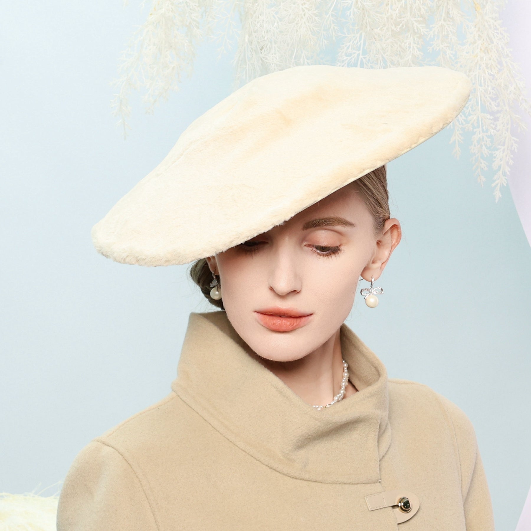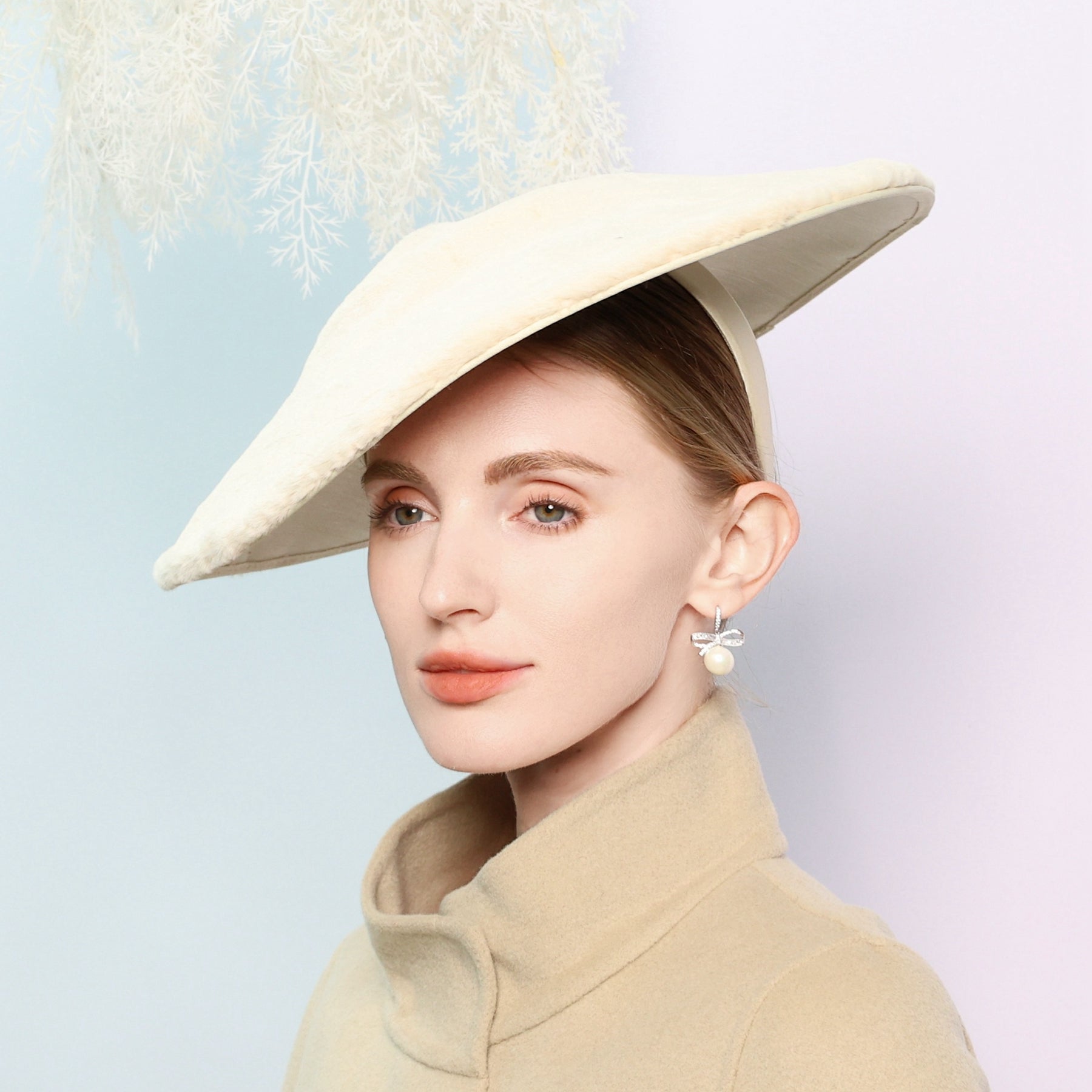 Introducing a stunning fascinator crafted from a plush, cream-colored synthetic or wool – blend fabric. This structured, wide – brimmed headpiece is a perfect addition for formal events, with its elegant silhouette and solid monochromatic design.