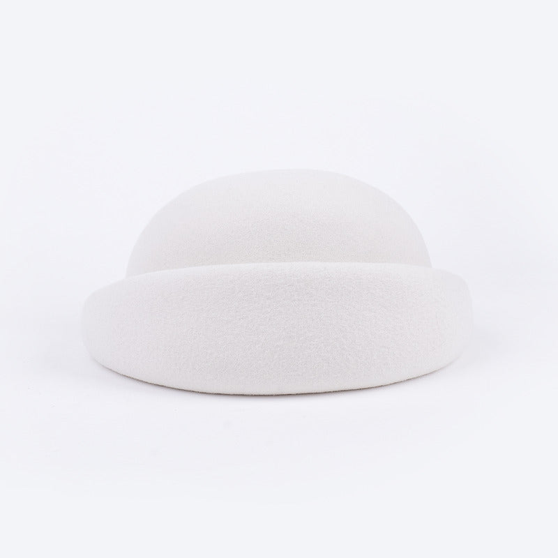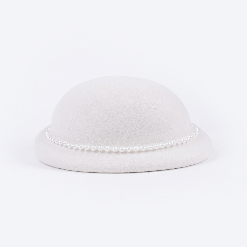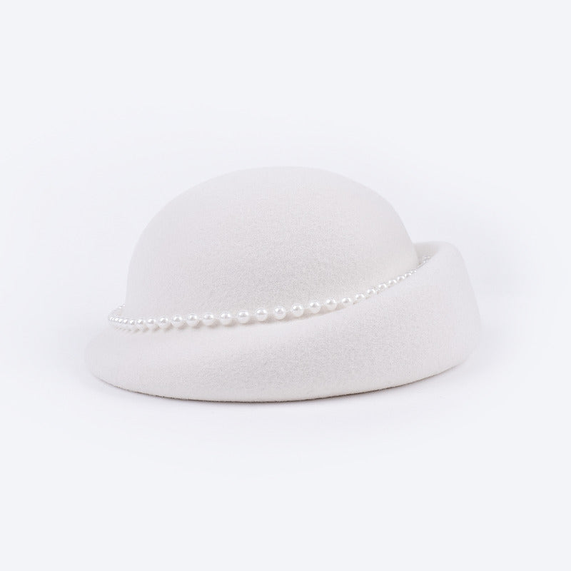 This is a formal and structured dress hat crafted from high – quality wool felt. It features a solid white color, offering a monochromatic and elegant look. A row of faux pearls encircles the crown, adding a touch of classic charm, making it perfect for special occasions.