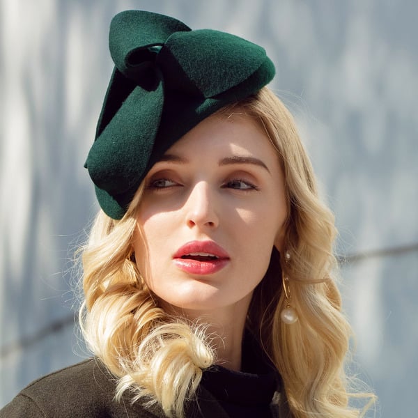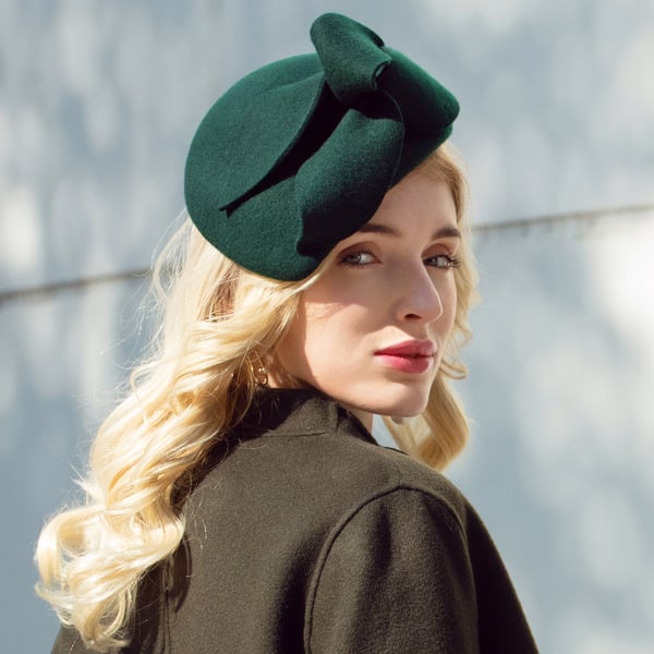 Step into timeless elegance with this forest green pillbox hat crafted from high – quality wool felt. Its structured dome – shaped crown and minimal brim create a classic, vintage silhouette, while a matching green fabric bow on the crown adds a touch of sophistication.