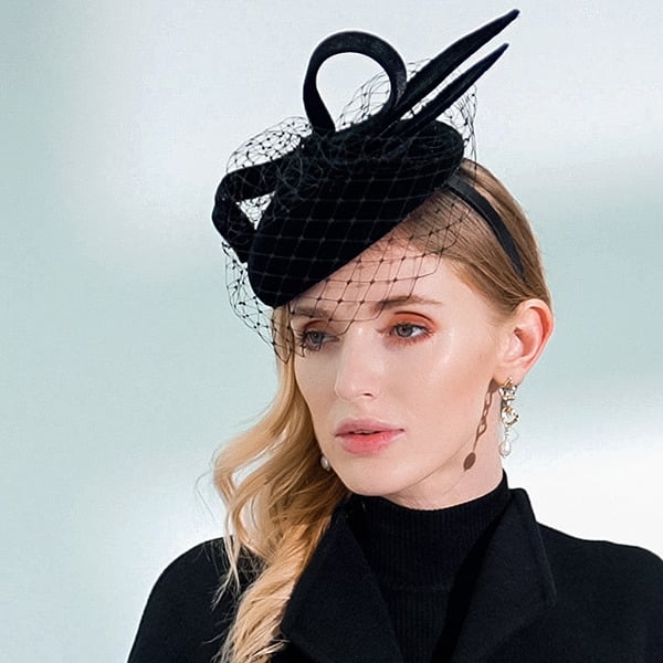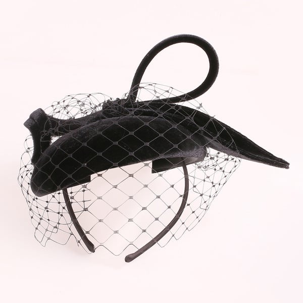 Introducing a stunning fascinator, a formal and ornate headpiece perfect for special events. Crafted from high – quality synthetic velvet, it features a solid black color scheme. The hat is adorned with velvet scrolls and loops on top and a fine black nylon mesh veil that falls gracefully over the forehead.
