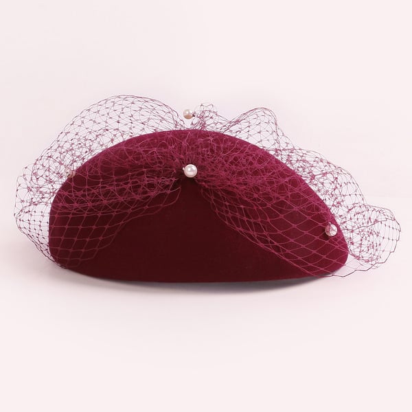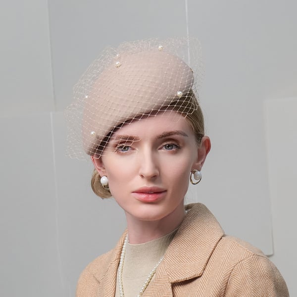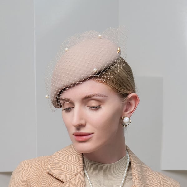 Discover this exquisite structured wool beret with a modern fashion twist. The hat features a pale beige wool felt crown, complemented by a white nylon tulle veil adorned with small, evenly – spaced white pearls. It combines classic elegance with a touch of contemporary style, perfect for formal events.